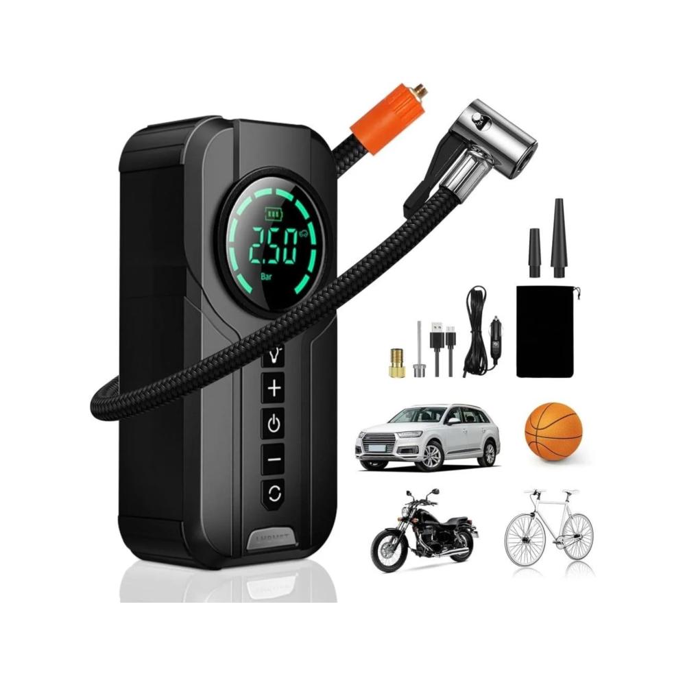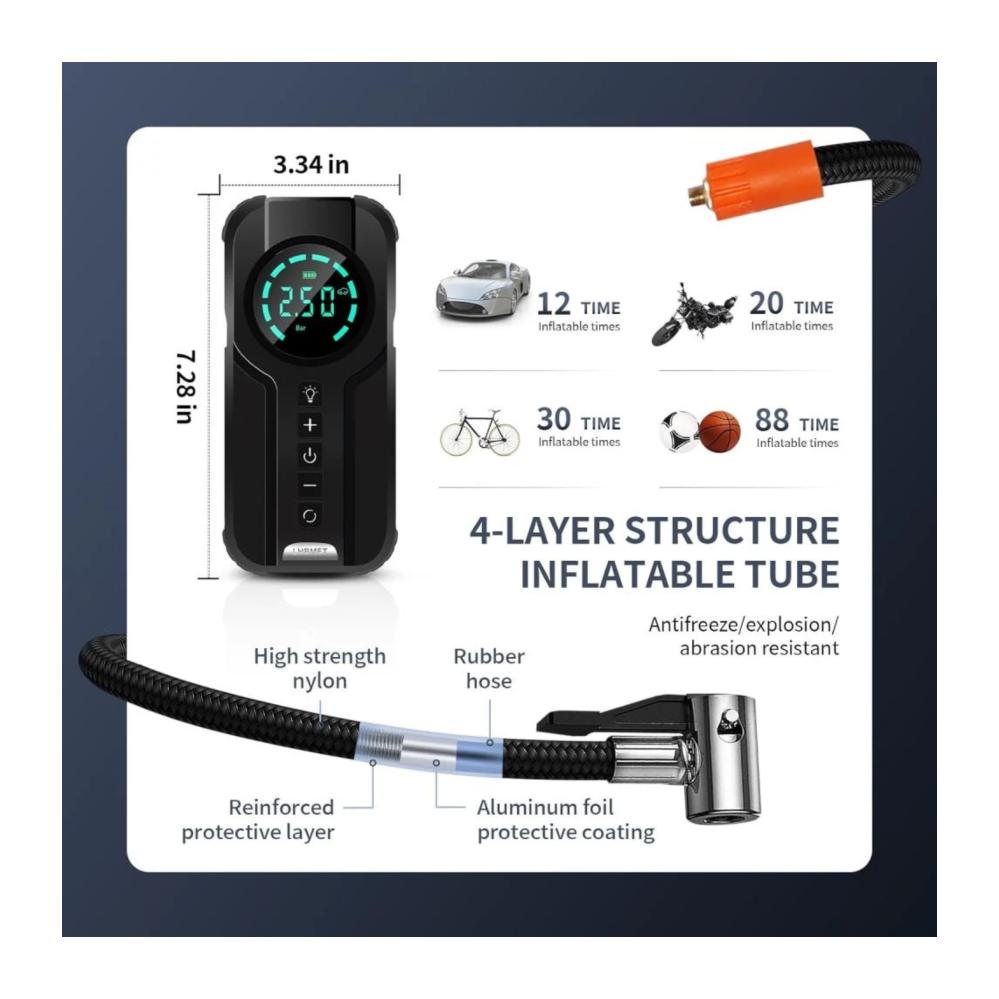 • يعمل منفاخ الهواء عالي التدفق 150PSI على نفخ إطارات السيارات والدراجات النارية والدراجات بسرعة. تعرض شاشة LED سهلة الاستخدام ضغط الإطارات حتى لا تضخمها كثيرًا عن طريق الخطأ